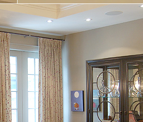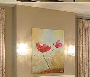 in pink faux crocodile. Windows are simply dressed with embroidered